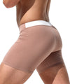 A biker short tailored to stand out, crafted from loop terry stretch cotton with a tan hue. Soft and fitted, featuring ample stretch for ease of mobility. The back of the waistband is optic white and branded with a tonal heat transfer logo. Hemmed at mid-quad, perfect for those low squats and lunges.
