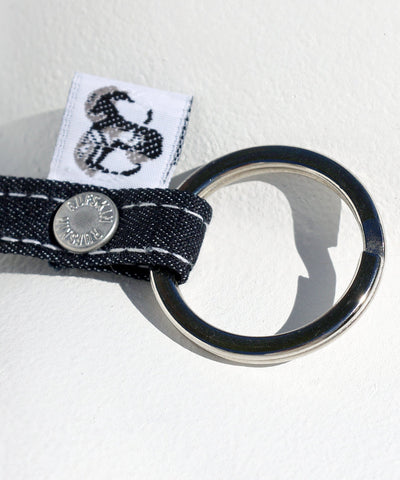Handcrafted keychain accessory made from non-stretch indigo denim. A chrome split ring is accented by RUFSKIN's signature branded rivet and ram head label.