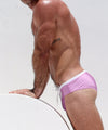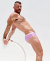 Effortless Summer swim brief made from a shiny stretch nylon with a unique metallic lavender hue. The full seat design boasts RUFSKIN's updated contoured pouch for ultimate comfort, while the contrasting waistband and adjustable side-tie logo drawcord in optic white add a fresh flair. Finished with a matte white rivet on the back.