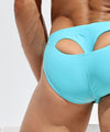 RUFSKIN's signature thong and swim brief fusion made from shiny stretch-nylon with a bright Versilia hue. Nick-named "trompe l'oeil" which means optical illusion in French, the back scoops low revealing a sliver of the t-back and a little skin. The pouch is contoured and features a faux fly, voiding the need for lining. The waistband is embellished with black ram head rivet.