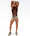 Meet 303: A new sport tank top exclusive to the Hot Numbers group made from premium stretch nylon with a rich, brown hue. Black shoulder straps extend from the back vertically down the torso ending at the contoured hem. The fabric features high stretch and shape retention ideal for any high intensity work out. Branded with matte black heat transfer logo mid back.