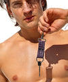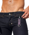 Hand-crafted keychain accessory made from genuine woven leather with a rich purple hue. The sides are intentionally left raw, creating a rugged frayed effect. One end is adorned with a sleek chrome hook clasp for effortless attachment, while the other features a polished chrome D-ring, subtly accented with RUFSKIN’s signature matte black rivets.