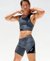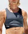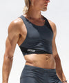 RUFSKIN's signature "torso tank" with a twist: Made from premium stretch-nylon with a lead grey hue, the base is matte while swooping panels at the right side and left shoulder are black with luminescent shine. Featuring tonal stitch and a new reflective heat transfer sport logo at right hem.
