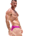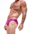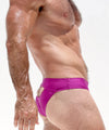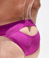 A daring swimwear brief made from premium stretch nylon with a unique metallic purple tint. The focus is on the back, designed with a revealing cut out exposing a portion of the cheeks, a RUFSKIN signature. The front is flat like the classic mini-sunga and lined for added support, debuting the new matte white branded plate front left.
