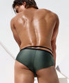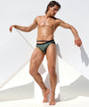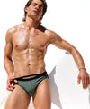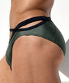 Swim brief made from shiny stretch-nylon with a deep metallic army hue. Featuring a contrast waistband in jet black, an overlapping asymmetrical strap wraps the other side of your waist while exposing a sliver of skin on the left side. Play with the straps and let your body do the talking, built with RUFSKIN's new contoured lined pouch. Diagonal back seams work to naturally highlight the rear, embellished with black ram head rivet at left hip.