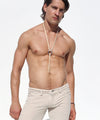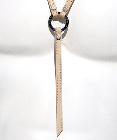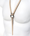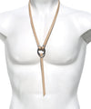 Handcrafted necklace accessory made from genuine leather with rich tan hue, embodying a bold yet refined aesthetic. Designed to drape effortlessly around the neck, a chic, branded chrome ring serves as the focal point, elegantly connecting to a secondary leather strip. Extending down the torso with an angular finish, adorned with silver branded rivets.