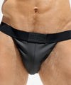 The return of the Euro-brief made from rubberized spandex with a jet black matte finish. The front and rear defining back yoke are solid while the seat is perforated for a little see-through action. Soft elastic wraps the waist, left open on the sides to show the quads, branded with RUFSKIN's new matte rubber label.