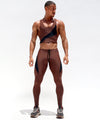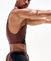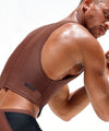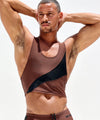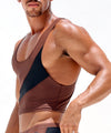 RUFSKIN's signature "torso tank" crafted from premium stretch nylon with a rich, brown hue. The front features a contrast, asymmetrical swooping sport stripe in jet black, cropped just above the naval. Built with high stretch, shape retention and sweat wicking properties, branded with a matte black heat transfer back right.