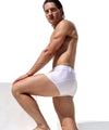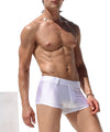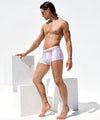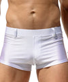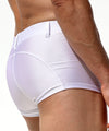 BANE is your go-to full-coverage swim trunk with a sculpted, body-hugging fit that makes a quiet statement. Cut from luxe stretch nylon with an optic white iridescence that shifts with the sunlight, it’s built to flex and flatter. The wide, enclosed waistband offers a smooth, secure feel, finished with belt loops for a refined touch. An arched hem highlights the quads, while a contoured back yoke defines the seat with clean lines. Subtle details like the tonal stitching, faux fly, and signature front rivet round it all out—effortlessly sharp, unmistakably summer.