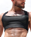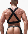 Looks like leather but feels like rubber, this cropped harness accessory is made from a custom perforated stretch spandex blend in jet black with a matte finish. A chest panel highlights the pecs while premium soft elastic makes an "X" across the back amplifying shoulder definition. Matte finish square rings tie it all together, branded with RUFSKIN's new rubber label mid back.