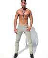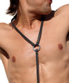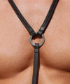 Handcrafted necklace accessory made from genuine leather with a deep brown hue, embodying a bold yet refined aesthetic. Designed to drape effortlessly around the neck, a chic, branded chrome ring serves as the focal point, elegantly connecting to a secondary leather strip. Extending down the torso with an angular finish, adorned with silver branded rivets.