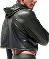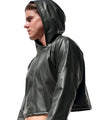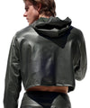 Meet Busby: A cropped long sleeve hoodie made from a new matte finish stretch leatherette with a deep "salamander" green hue. Fitted on the arms but not restricting, the torso is slightly relaxed, featuring RUFSKIN's signature asymmetrical hood adorned with a black ram head rivet. Note: Cold water wash, tumble dry low inside out, hand wash recommended.