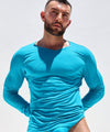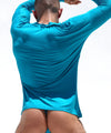 With inspiration from the traditional Japanese kimono, this long sleeve top features an asymmetrical neck that extends diagonally across the chest and highlights the pecs. Built with RUFSKIN's signature kimono sleeve, a staple design feature from the early days, made from supple stretch rayon with a bright turquoise hue. Lightweight and flowy, an effortless top subtly branded with a silver rivet at left cuff.