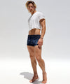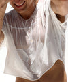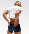 Oversized cropped football-style jersey made from a soft stretch-cotton modal-rayon blend with a bone hue, an ideal beachwear or post swim top. A custom water-based silk screen with RUFSKIN's "disco" logo wraps the torso and back, featuring raw edges and finished with sporty flat lock stitch, a yoke frames the shoulders. Pre-washed for a worn-in feel, the optic white logo is even more visible when wet (shown with the PAZ dark distressed shorts).